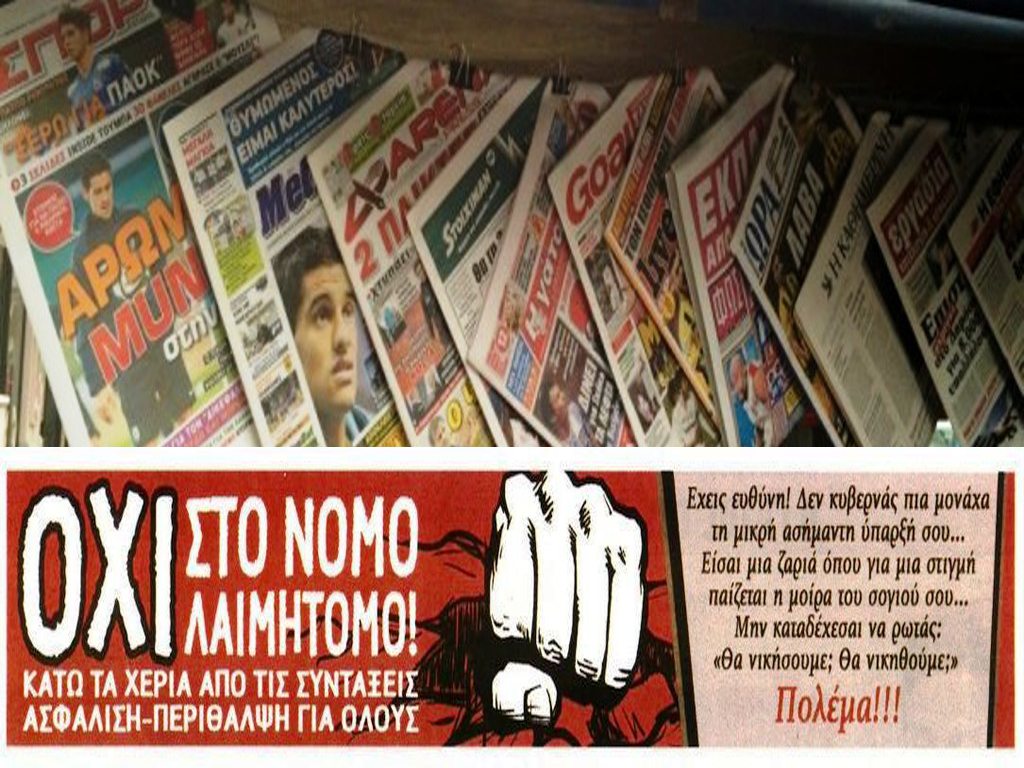 Όλες οι αθλητικές εφημερίδες κυκλοφόρησαν σήμερα με κοινό “χτύπημα” στα πρωτοσέλιδα τους κατά του νόμου της κυβέρνησης για το ασφαλιστικό. Σε αυτό αναφέρεται χαρακτηριστικά: “Όχι στο νόμο λαιμητόμο. Μην καταδέχεσαι να ρωτάς: ‘Θα νικήσουμε; Θα νικηθούμε;’ Πολέμα”.