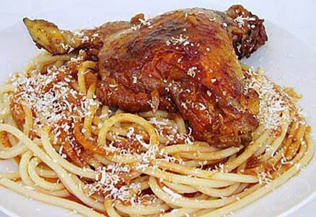 – Τα ανακατεύετε να πάει η σάλτσα παντού, σερβίρετε τον κόκορα με τα μακαρόνια σε μια πιατέλα και τα πασπαλίζετε με το τυρί.