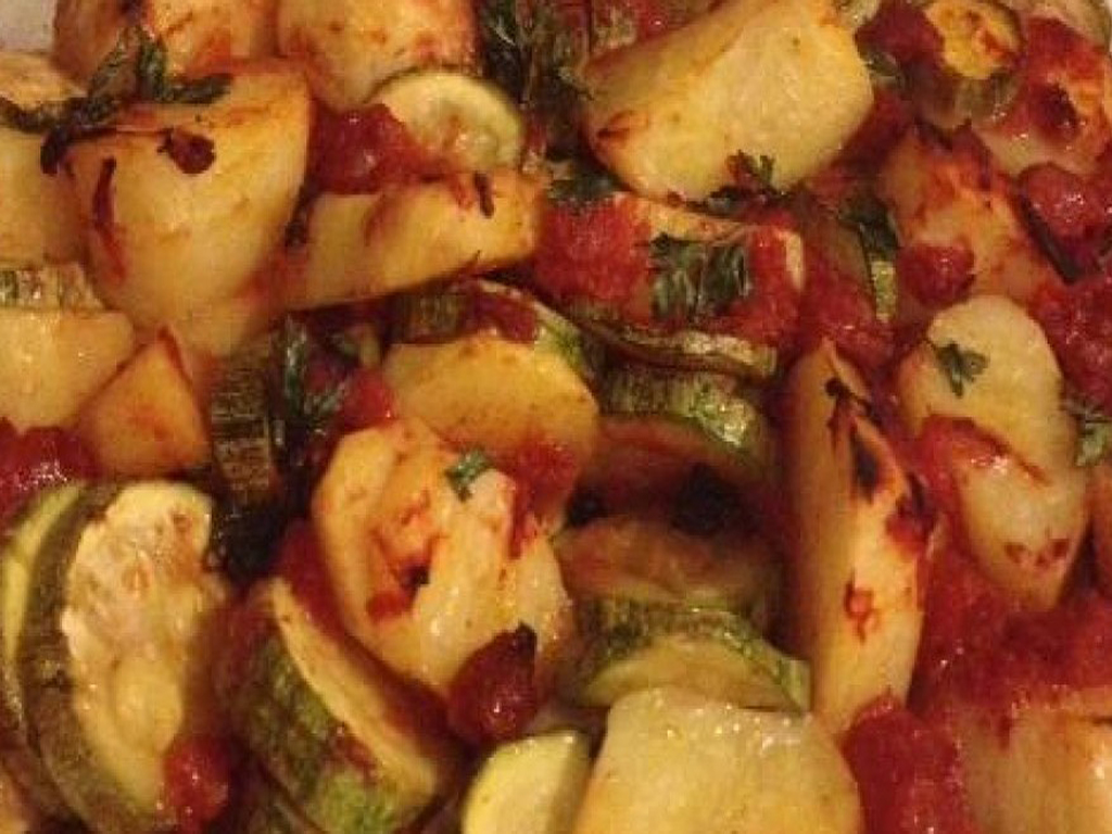 – Βάζουμε στο ταψί του φούρνου τα κολοκυθάκια και τις πατάτες και στη συνέχεια ρίχνουμε τις φέτες του σκόρδου, τις αλεσμένες ντομάτες, το λάδι, το αλάτι και όλα τα μπαχαρικά. Τα ανακατεύουμε καλά και από πάνω ρίχνουμε τον ψιλοκομμένο μαϊδανό. Όπως είναι πολύχρωμο και στολισμένο το ταψί μας, το βάζουμε στον φούρνο.