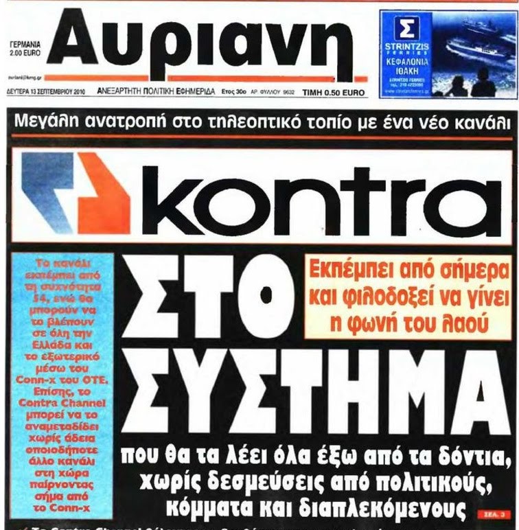 Πρόστιμο 15.000 ευρώ στο τηλεοπτικό κανάλι ΚΟΝΤΡΑ (πρώην ΤΗΛΕΦΩΣ) αποφάσισε το ΕΣΡ, διότι ο σταθμός ενώ δηλώνει “μη ενημερωτικός” έχει ενημερωτικές εκπομπές.