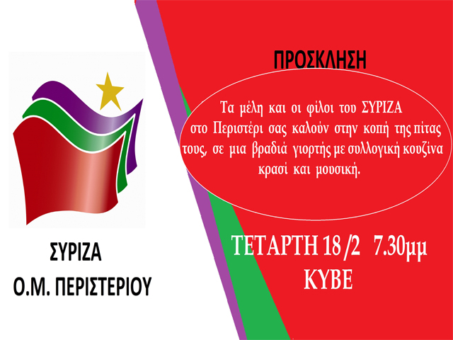 Την πρωτοχρονιάτικη της πίτα κόβει, την Τετάρτη 18 Φεβρουαρίου, η Οργάνωση Μελών του ΣΥΡΙΖΑ Περιστερίου.