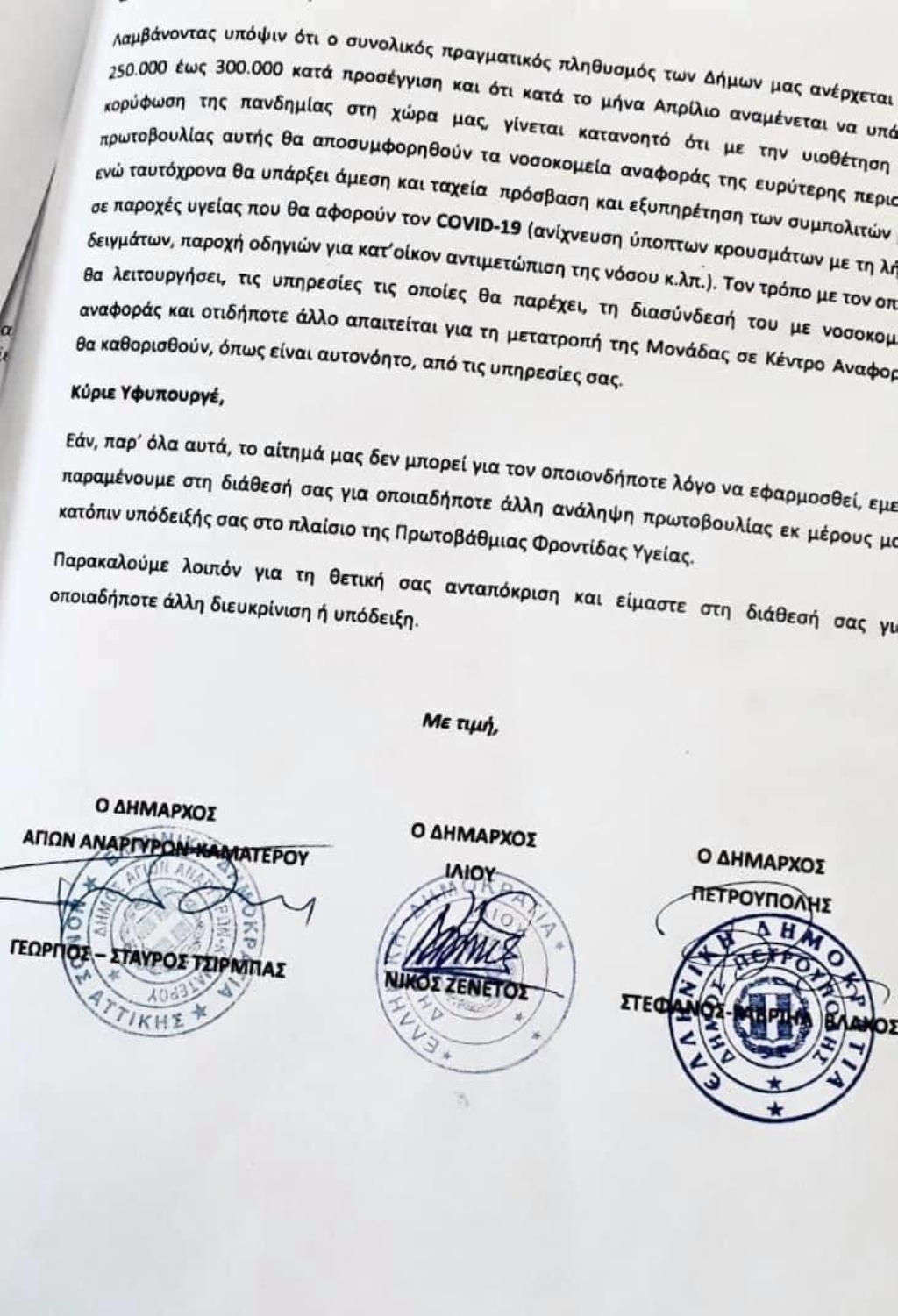 Την ένταξη ενός Κέντρου Υγείας που θα καλύπτει τρεις δήμους της Αττικής, στον σχεδιασμό για την αντιμετώπιση του κορωνοϊού covid-19, ζητούν οι δήμαρχοι Ιλίου Νίκος Ζενέτος, Πετρούπολης Στέφανος Γαβριήλ Βλάχος και Αγίων Αναργύρων-Καματερού Σταύρος Τσίρμπας, με κοινή επιστολή τους προς το υπουργείο Υγείας.