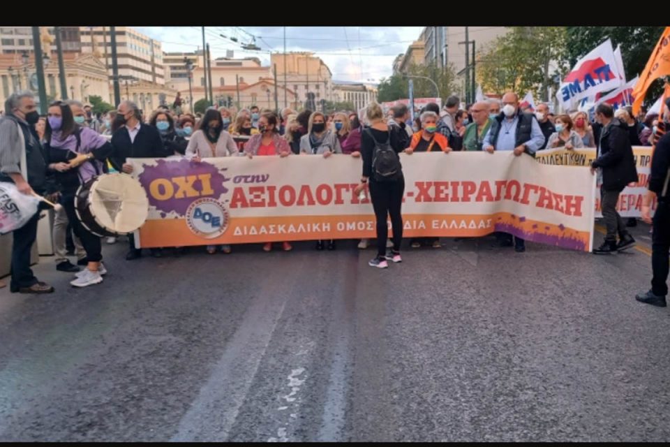 Διαδήλωση από μέλη της εκπαιδευτικής κοινότητας πραγματοποιείται έξω από τα Προπύλαια ενάντια στο νομοσχέδιο του υπουργείου Παιδείας για την αξιολόγηση της σχολικής μονάδας και του εκπαιδευτικού έργου.