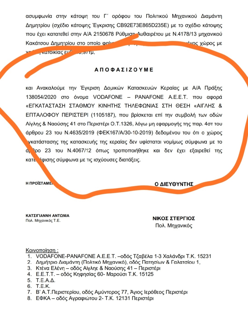 Να υλοποιηθεί η απόφαση για ανάκληση της άδειας της συγκεκριμένης κεραίας.