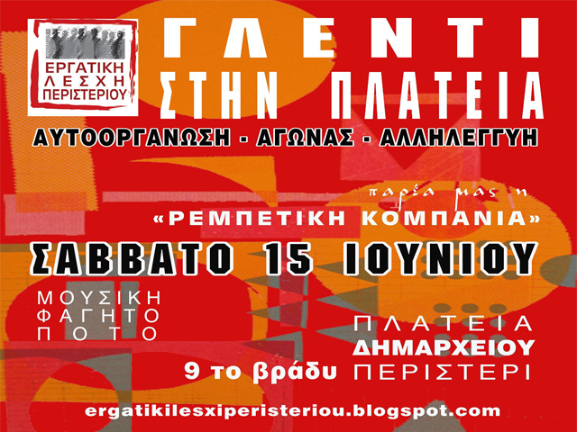 Η Εργατική Λέσχη Περιστερίου διοργανώνει λαϊκό – ρεμπέτικο γλέντι στην πλατεία Δημαρχείου το Σάββατο 15 Ιουνίου 9 το βράδυ.