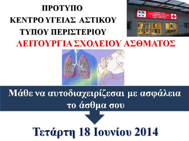 Στο πρότυπο Κέντρο Υγείας Αστικού Τύπου Περιστερίου θα λειτουργήσει δωρεάν σχολείο άσθματος “Μάθε να αυτοδιαχειρίζεσαι με ασφάλεια το άσθμα σου”, την Τετάρτη 18 Ιουνίου 2014, ώρα 5:00 το απόγευμα.