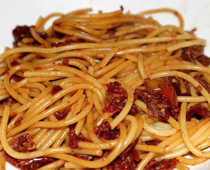 Απλή, γρήγορη και νόστιμη μακαρονάδα, με λιαστή ντομάτα και σκόρδο.