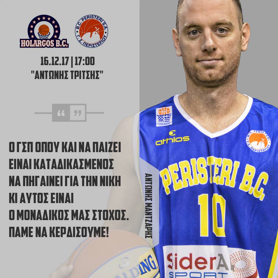 Ο Αντώνης Μάντζαρης μιλώντας στην επίσημη ιστοσελίδα (gsperisteri.gr) του Συλλόγου, αναφέρθηκε στην επικείμενη αναμέτρηση, δίνοντας το σύνθημα για το 10/10 και την παραμονή στην κορυφή.