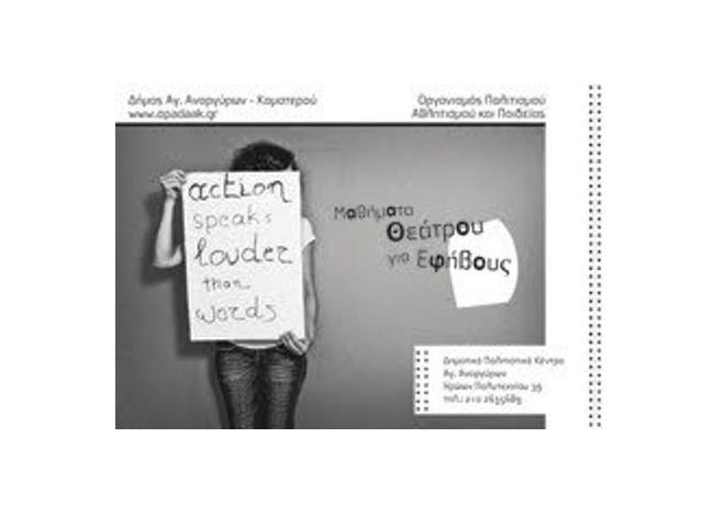 Στο « Θεατρικό εργαστήρι» του Οργανισμού Πολιτισμού Αθλητισμού και Παιδείας Δήμου Αγίων Αναργύρων Καματερού, γίνονται μαθήματα θεάτρου για εφήβους καθημερινές 4.00 – 7.00 μμ έως δύο φορές την εβδομάδα.