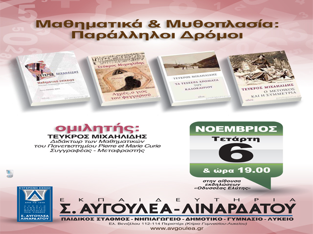 Την Τετάρτη 6 Νοεμβρίου και ώρα 7.00 μ.μ., τα εκπαιδευτήρια Σ. Αυγουλέα-Λιναρδάτου, στην αίθουσα εκδηλώσεων του σχολείου, Οδυσσέας Ελύτης.