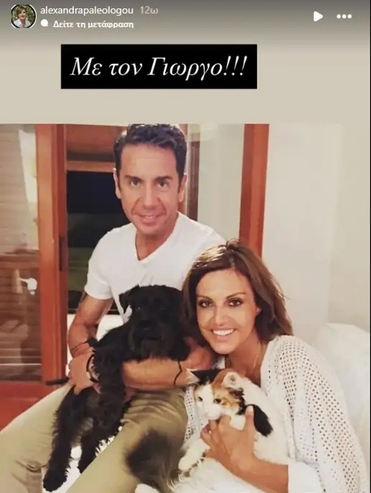 «Με τον Γιώργο», έγραψε η Αλεξάνδρα Παλαιολόγου στην ανάρτησή της. Παράλληλα, μοιράστηκε και μία φωτογραφία τους από το παρελθόν στην οποία οι δυο τους πόζαραν παρά με τους τετράποδους φίλους τους.