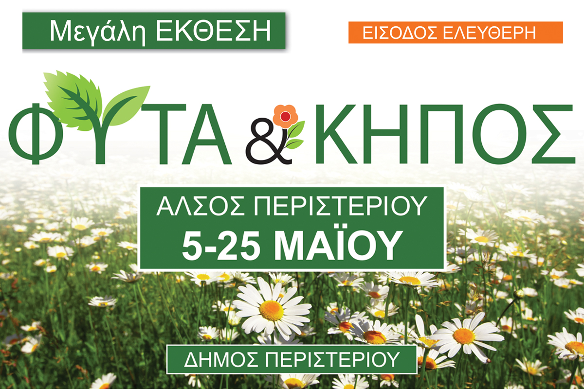 O Δήμος Περιστερίου διοργανώνει την 1η πανελλήνια έκθεση «Φυτά και Κήπος», στο Άλσος Περιστερίου, από 5 έως 25 Μαΐου. Πρόκειται για μια πρωτοποριακή δράση στην Ελλάδα και διοργανώνεται σε συνεργασία με την Ένωση Φυτωριούχων Ελλάδος.