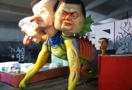 Την τρικομματική κυβέρνηση σατιρίζει με χαρακτηριστικό τρόπο το πλήρωμα 40 του Πατρινού Καρναβαλιού. Κατασκευαστής του είναι ο Ένο Σκονδράνι.