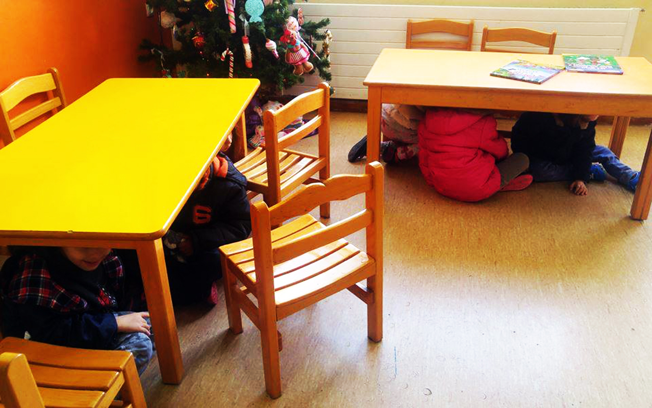 Ειδικά στα σχολεία ακολουθήθηκαν όλες οι οδηγίες ασφαλείας ως προς την άσκηση σεισμού με τους μικρούς μαθητές να εφορμούν κάτω από τα θρανία με το έναυσμα των υπευθύνων για υποτιθέμενο σεισμό.