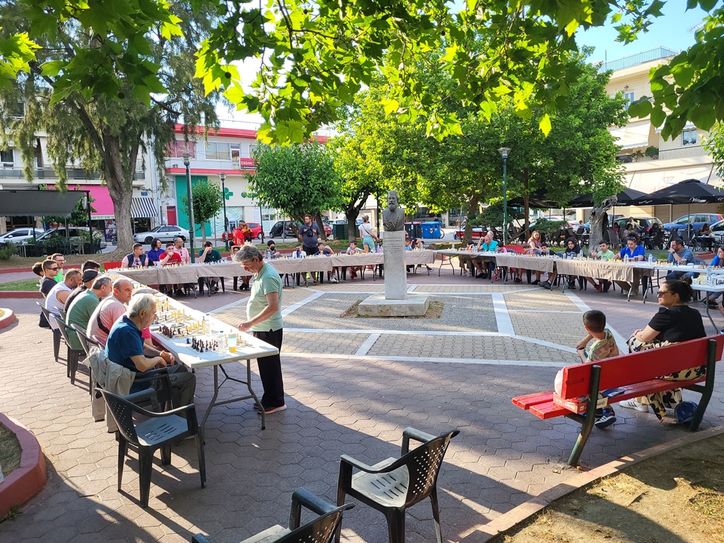 Το απόγευμα της Κυριακής, 33 σκακιστές και σκακίστριες κάθε ηλικίας και επιπέδου, εκπροσωπώντας διάφορους σκακιστικούς συλλόγους και όχι μόνο, συγκεντρώθηκαν στην πλατεία για να συμμετάσχουν σε ένα σιμουλτανέ εναντίον του κορυφαίου Έλληνα γκραν μετρ (GM), Βασίλη Κοτρωνιά. Η ήσυχη ατμόσφαιρα της πλατείας επέτρεψε στους συμμετέχοντες να απολαύσουν το παιχνίδι, με στιγμές χαλάρωσης και χιούμορ, ενώ ο ίδιος ο GM δεν δίστασε να ανταλλάξει πειράγματα με τους αντιπάλους του.