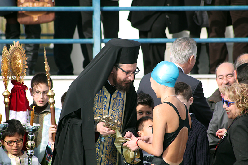 Η τυχερή κολυμβήτρια που κατάφερε να ανασύρει από τα ύδατα το Σταυρό δέχθηκε από τον κ. Παχατουρίδη και τον Αρχιμανδρίτη Μάξιμο ένα σταυρό και τιμητικά δώρα τα οποία πήραν και τα υπόλοιπα παιδιά που βούτηξαν στη πισίνα.