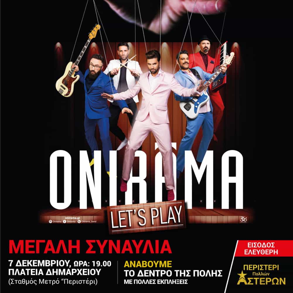 Στην εκδήλωση που θα πραγματοποιηθεί την Παρασκευή 7 Δεκεμβρίου στις 19.00 στην πλατεία Δημαρχείου θα συμμετέχει το συγκρότημα Onirama σε μια μεγάλη συναυλία.