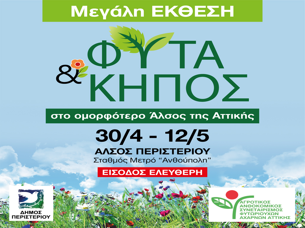 Η μεγάλη έκθεση «ΦΥΤΑ & ΚΗΠΟΣ» και φέτος στο ομορφότερο Άλσος της Αττικής, στο Άλσος Περιστερίου (στάση Μετρό “Ανθούπολη”) από τις 30 Απριλίου έως και 12 Μαΐου 2019, ώρες 10:00 – 22:00. Είσοδος Ελεύθερη!