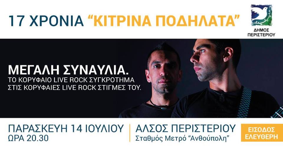 Το γνωστό ελληνικό Rock συγκρότημα «Κίτρινα Ποδήλατα» θα βρεθεί στο Άλσος Περιστερίου για μια μοναδική συναυλία.
