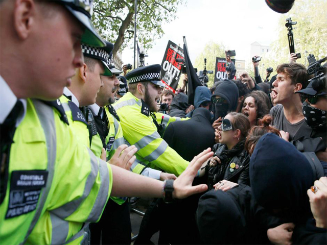 Διαδηλωτές πέταξαν μπουκάλια, κουτιά από κονσέρβες και καπνογόνα εναντίον αστυνομικών στο κέντρο του Λονδίνου το Σάββατο στη διάρκεια μιας διαδήλωσης κατά της επανεκλογής του συντηρητικού πρωθυπουργού Ντέιβιντ Κάμερον.