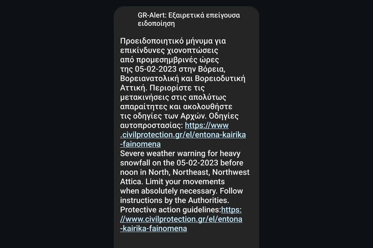 Συγκεκριμένα το μήνυμα αναφέρει ότι θα γίνουν επικίνδυνες χιονοπτώσεις την Κυριακή (5/2) από τις προμεσημβρινές ώρες και μετά στην Βόρεια, ΒορειοΑνατολική και ΒορειοΔυτική Αττική.