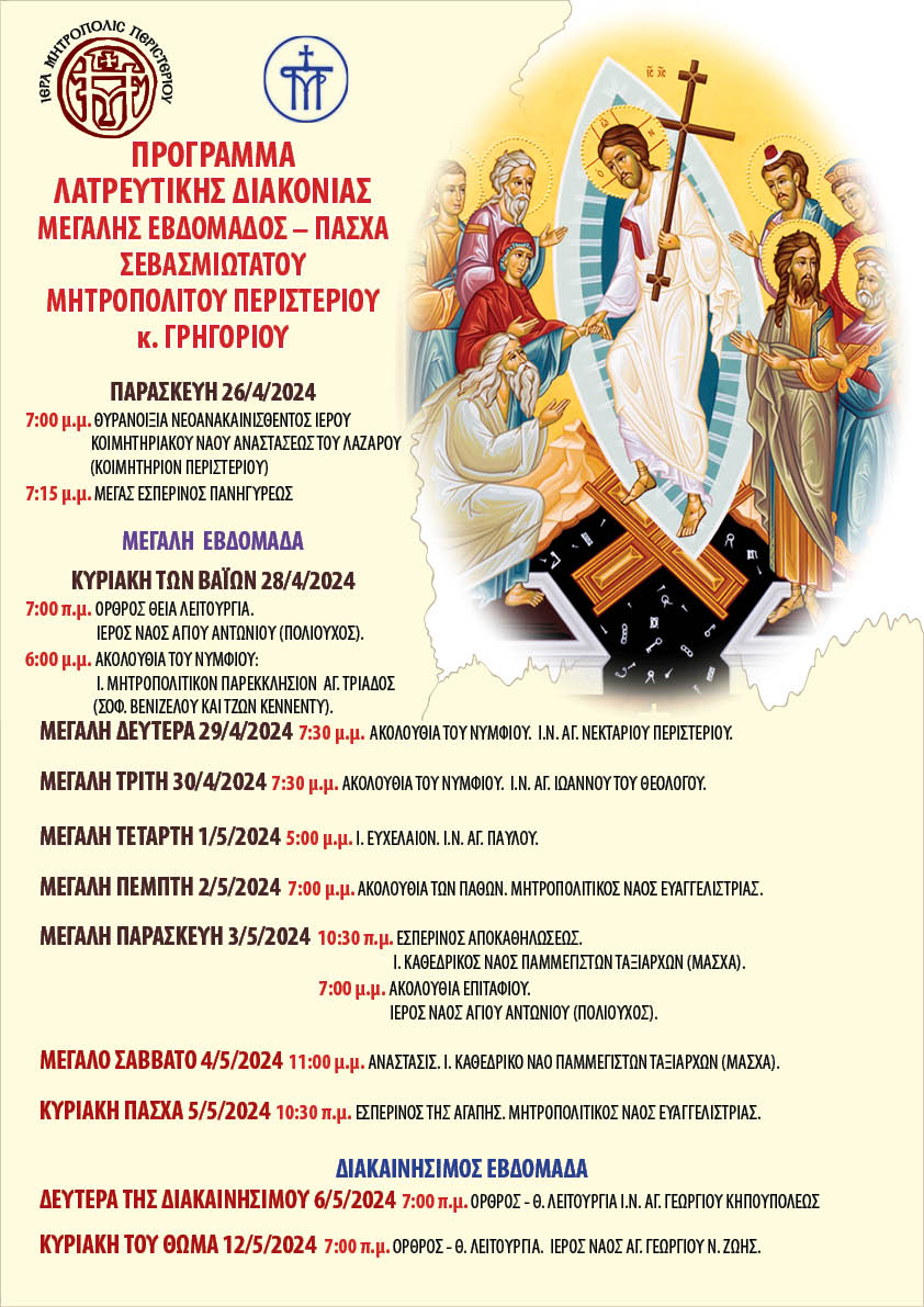 Στη δημοσιότητα έδωσε το πρόγραμμα του Σεβασμιότατου Μητροπολίτη Περιστερίου κ. Γρηγόριου για τη Μεγάλη Βδομάδα η Μητρόπολη Περιστερίου.