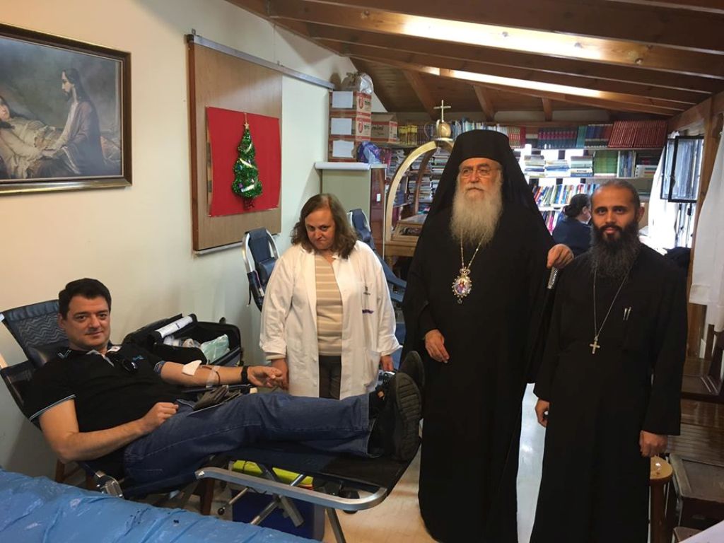 Ακολούθως, ο Σεβασμιώτατος μετέβη στον Μητροπολιτικό Ιερό Ναό Ευαγγελισμού της Θεοτόκου όπου ευλόγησε την Αιμοδοσία, επικοινώνησε με τους εθελοντές αιμοδότες της Μητροπόλεως μας και ομίλησε σχετικώς περί της υψηλής σημασίας αυτής της κοινωνικής προσφοράς. Επήνεσε τον υπεύθυνο της Αιμοδοσίας του Ιερού Μητροπολιτικού Ναού Αιδεσιμ. Πρωτοπρ. Αλέξανδρο Ζαρίκο για την άρτια οργάνωση και ευχήθηκε σε όλους Καλά και Ευλογημένα Χριστούγεννα. Επίσης, ο Σεβασμιώτατος ευχαρίστησε όλες τις υπεύθυνες κυρίες του φιλοπτώχου, οι οποίες συνεγκέντρωναν στην είσοδο του Ναού Τρόφιμα για τους ενδεείς αδελφούς μας.