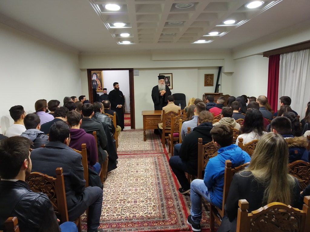 Το εσπέρας της ιδίας ημέρας ο Σεβασμιώτατος είχε τη χαρά να δεχθεί στο Επισκοπείο της Μητροπόλεως μας, κατόπιν προσωπικής του προσκλήσεως, φοιτητές της πόλεώς μας στην πρώτη συνάντηση γνωριμίας και επικοινωνίας μαζί τους. Στην πρώτη αυτή συνάντηση γνωριμίας ανταποκρίθηκαν περίπου 100 φοιτητές όπου και καθορίστηκε οι συγκεντρώσεις αυτές να είναι μηνιαίες με θεματολογία που να ενδιαφέρει τους νέους και να προτείνεται από τους ιδίους.