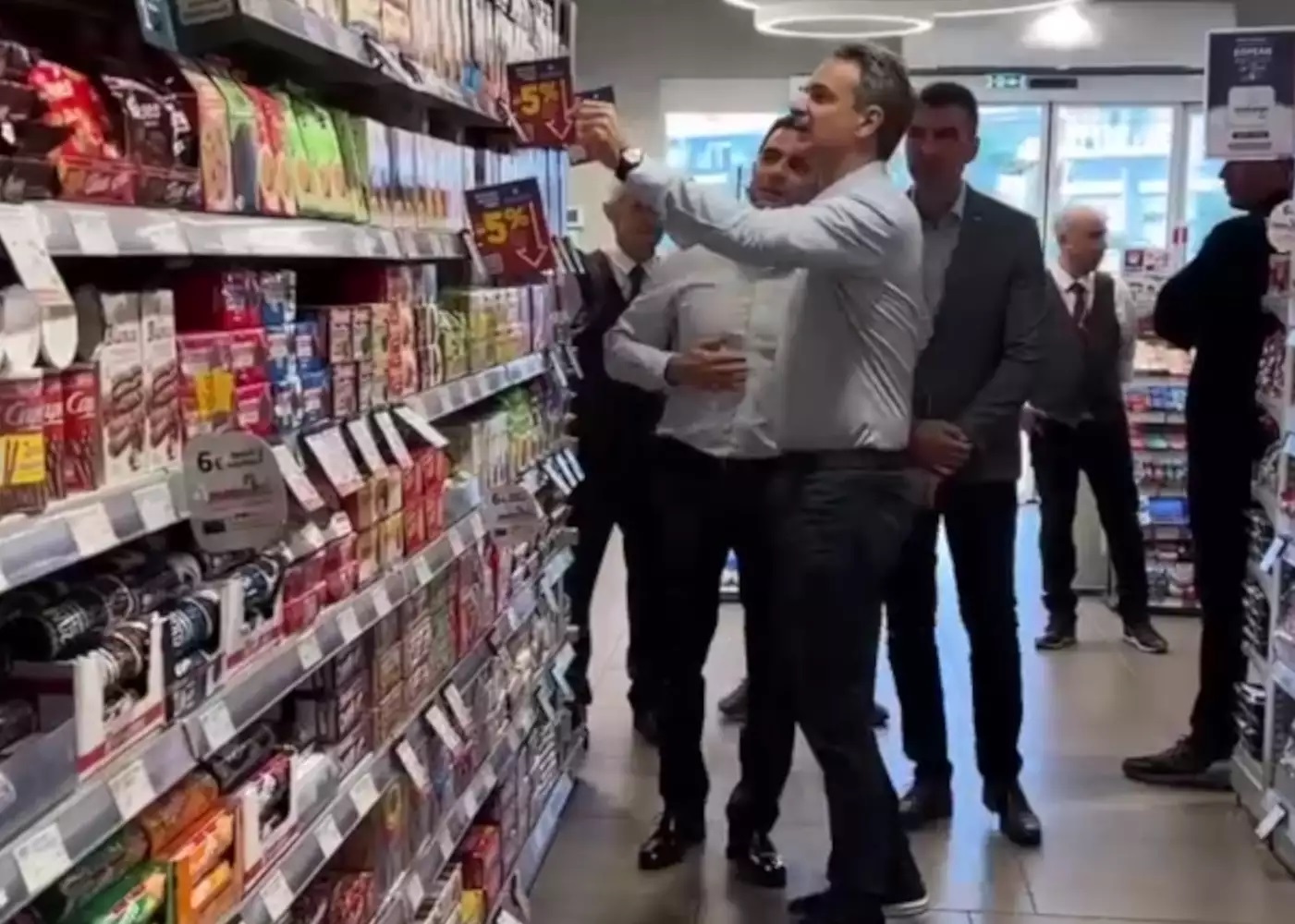 Eπίσκεψη σε σούπερ μάρκετ πραγματοποίησε ο πρωθυπουργός Κυριάκος Μητσοτάκης, συνοδεία του υπουργού Ανάπτυξης, Κώστα Σκρέκα, προκειμένου να ελέγξει τις τιμές στα τρόφιμα και την εφαρμογή της μειωμένης τιμής κατά 5%.