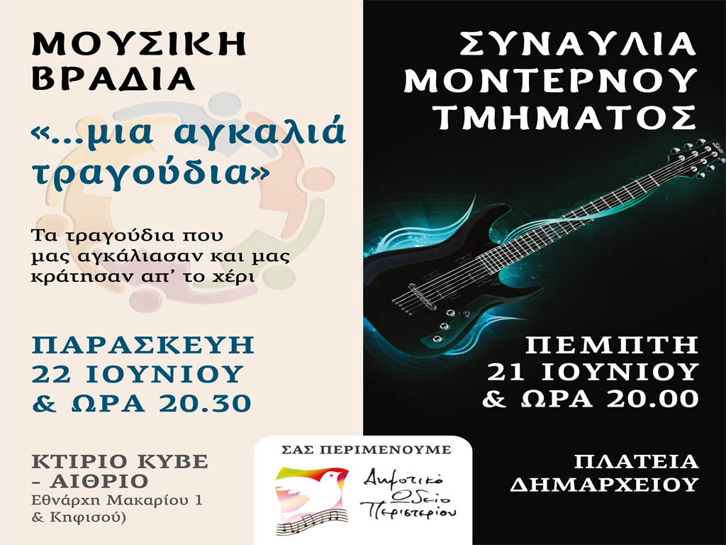 – Παρασκευή 22 Ιουνίου 2018, ώρα 20.30 στο κτίριο ΚΥΒΕ (Εθν. Μακαρίου 1 & Κηφισού): Συναυλία από το Εργαστήριο Σύγχρονου Τραγουδιού του Δημοτικού Ωδείου Περιστερίου.