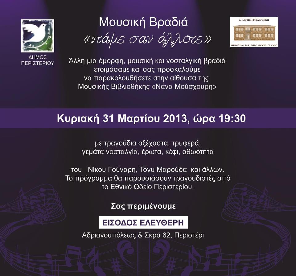 Στην αίθουσα της Μουσικής Βιβλιοθήκης «Νάνα Μούσχουρη» (Σκρα 62 & Αδριανουπόλεως), την Κυριακή 31 Μαρτίου 2013, ώρα 19:30, με τραγούδια αξέχαστα, τρυφερά, γεμάτα νοσταλγία, έρωτα, κέφι, αθωότητα του Νίκου Γούναρη, Τόνυ Μαρούδα και άλλων.