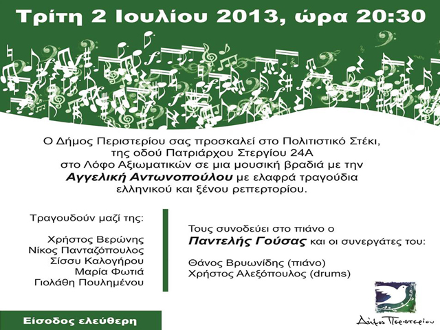 Ο Δήμος Περιστερίου διοργανώνει στο Πολιτιστικό Στέκι Λόφου Αξιωματικών, της οδού Πατριάρχου Στεργίου 24Α, μουσική βραδιά με την Αγγελική Αντωνοπούλου με ελαφρά τραγούδια ελληνικού και ξένου ρεπερτορίου, την Τρίτη 2 Ιουλίου και ώρα 20:30.