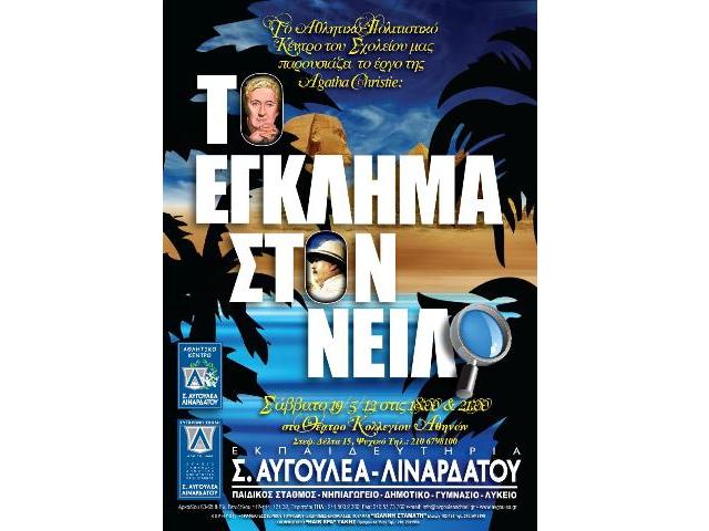 Οι μαθητές του Αθλητικού και Πολιτιστικού Κέντρου των Εκπαιδευτηρίων Σ. Αυγουλέα-Λιναρδάτου ανεβάζουν στις 19 Μαϊου, στο θέατρο του Κολλεγίου Αθηνών, τη μουσικοχορευτική παράσταση «Έγκλημα στον Νείλο» βασισμένη στο ομώνυμο μυθιστόρημα της Αγκάθα Κρίστι.