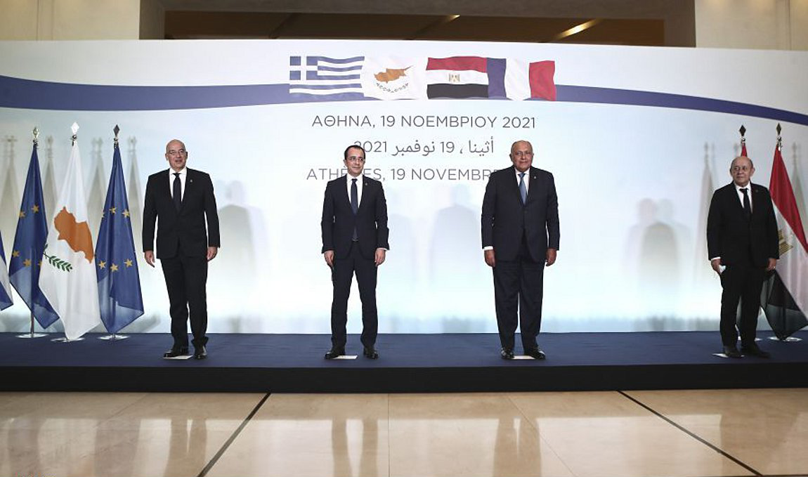 Οι υπουργοί Εξωτερικών της Ελλάδας, της Κύπρου, της Αιγύπτου και της Γαλλίας εξέτασαν τις κοινές προκλήσεις και ευκαιρίες στην ευρύτερη περιοχή, στην Ανατολική Μεσόγειο, στη Μέση Ανατολή, στο Σαχέλ, καθώς και την εμβάθυνση της συνεργασίας τους σε στρατηγικούς τομείς, όπως η ενέργεια, η οικονομία, ο τουρισμός, η διασυνδεσιμότητα. Επίσης, συζήτησαν ζητήματα όπως η εξάπλωση της τρομοκρατίας στην Αφρική, η μετανάστευση, η πρόσβαση σε βασικά αγαθά όπως το νερό του Νείλου.