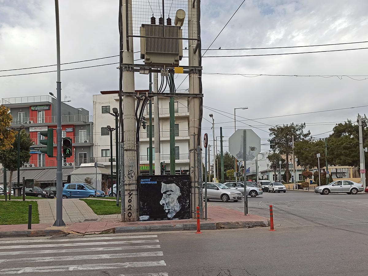 Συγκεκριμένα οι μορφές των Γρηγόρη Μπηθικώτση και Γιάννη Πουλόπουλου απεικονίζονται στη βάση ενός πυλώνα ρεύματος.