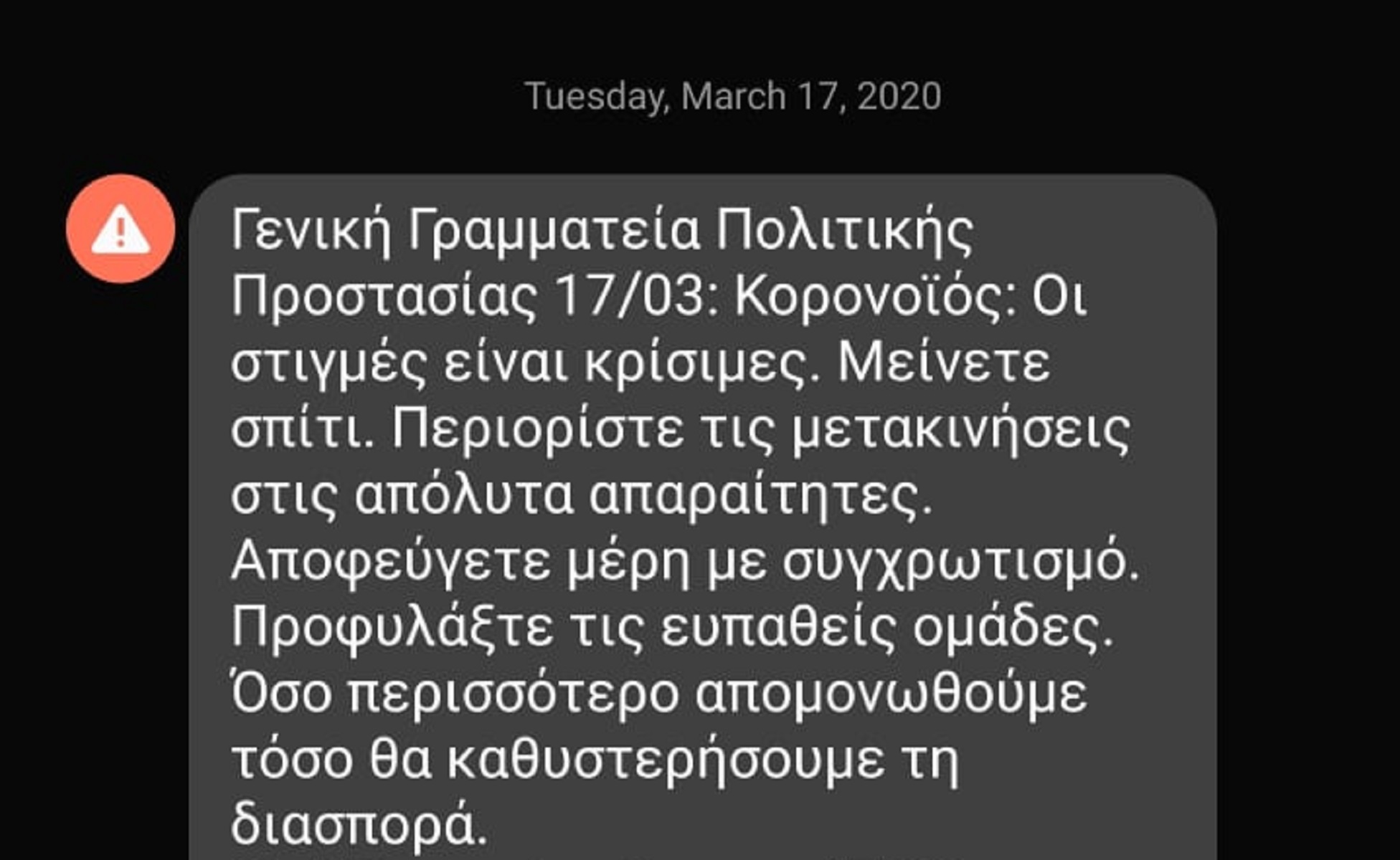«Γενική Γραμματεία Πολιτικής Προστασίας 17/03: Κορoνοϊός: Οι στιγμές είναι κρίσιμες. Μείνετε σπίτι. Περιορίστε τις μετακινήσεις στις απόλυτα απαραίτητες. Αποφεύγετε μέρη με συγχρωτισμό. Προφυλάξτε τις ευπαθείς ομάδες. Οσο περισσότερο απομονωθούμε τόσο θα καθυστερήσουμε τη διασπορά».