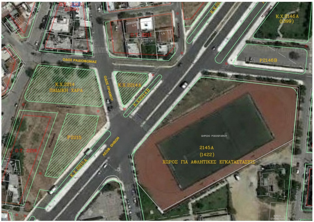 Πρόκειται για ακίνητα επί των οδών Ραδιοφωνίας, Πριάμου και Λεωφ.Θηβών στα Ο.Τ.2214 (παιδική χαρά) – Ο.Τ.2214Α (ΚΧ Πράσινο) – Ο.Τ.2215 (χώρος στάθμευσης) στην περιοχή Ραδιοφωνίας, συνολικού εμβαδού 3240,07 τ.μ.