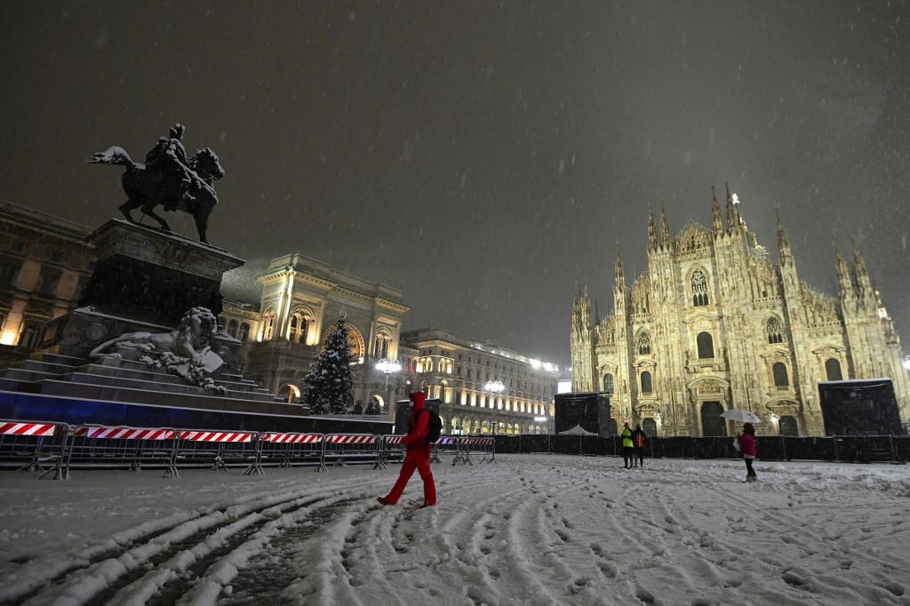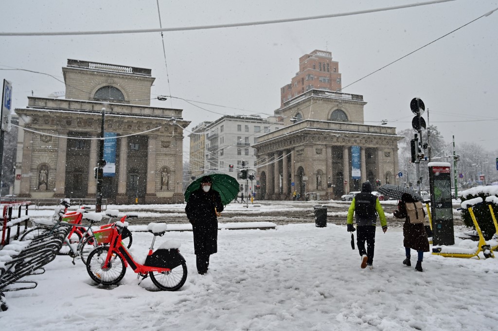 Δημοτικοί υπάλληλοι, φορώντας μάσκες, βγήκαν από τα ξημερώματα έξω για να καθαρίσουν με φτυάρια το στρώμα του χιονιού, ύψους 15 εκατοστών, που είχε καλύψει την κεντρική πλατεία Duomo, με την κυκλοφορία στους δρόμους, αν και αραιή, να διεξάγεται μετ’ εμποδίων λόγω της ολισθηρότητας του οδοστρώματος.
