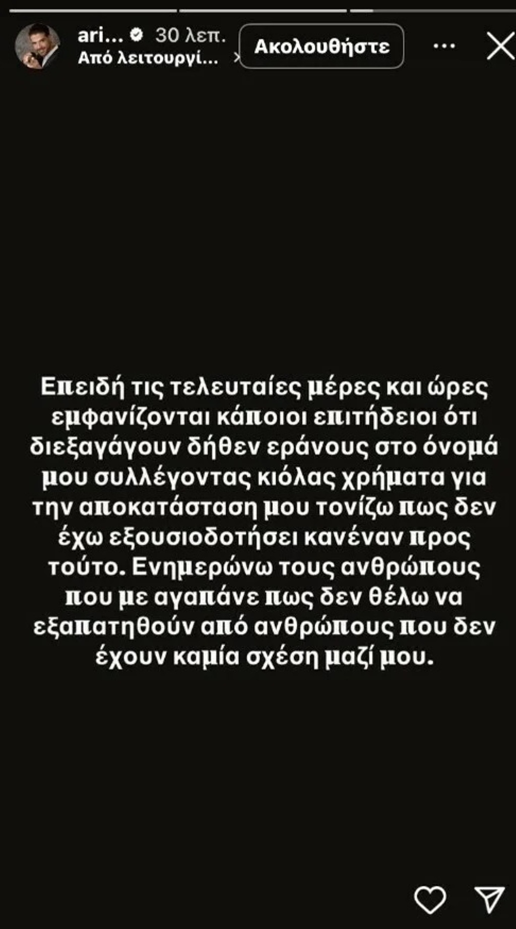 «Επειδή τις τελευταίες ημέρες και ώρες εμφανίζονται κάποιοι επιτήδειοι ότι διεξαγάγουν δήθεν εράνους στο όνομά μου συλλέγοντας κιόλας χρήματα για την αποκατάστασή μου τονίζω πως δεν έχω εξουσιοδοτήσει κανέναν προς τούτο. Ενημερώνω τους ανθρώπους που με αγαπάνε πως δεν θέλω να εξαπατηθούν από ανθρώπους που δεν έχουν καμία σχέση μαζί μου» έγραψε ο Άρης Μουγκοπέτρος.