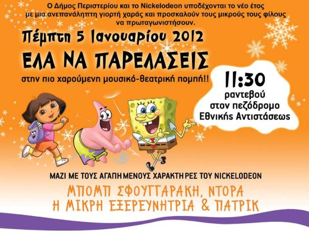 Με αφετηρία τον πεζόδρομο της Εθνικής Αντιστάσεως, την Πέμπτη 5 Ιανουαρίου στις 11:30, οι μικροί και όχι μόνο φίλοι του Nickelodeon θα έχουν την ευκαιρία να ακολουθήσουν την Ντόρα τη Μικρή Εξερευνήτρια, τον Μπομπ Σφουγγαράκη και τον Πάτρικ Αστερία στην πιο χαρούμενη μουσική παρέλαση!