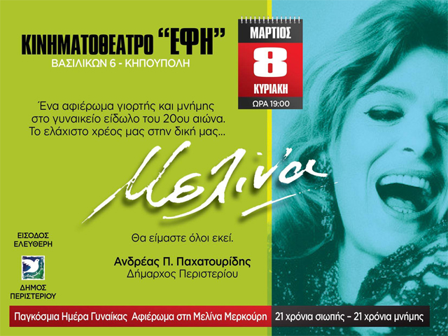 Με μια εκδήλωση – αφιέρωμα στη γυναίκα – είδωλο, Μελίνα Μερκούρη, που φέτος κλείνουν 21 χρόνια από το θάνατό της, γιορτάζεται η μέρα της γυναίκας στο Δήμο Περιστερίου, την Κυριακή 8 Μαρτίου 2015, ώρα 19:00 στο νέο Κινηματοθέατρο ΕΦΗ (Βασιλικών 6, Κηπούπολη). Είσοδος ελεύθερη.