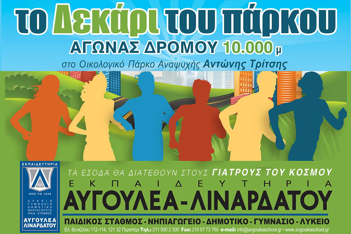 Τα Εκπαιδευτήρια Αυγουλέα-Λιναρδάτου το Σάββατο 9 Απριλίου, στο πλαίσιο των πασχαλινών ανθρωπιστικών δραστηριοτήτων του Σχολείου, διοργανώνουν στο Πάρκο Περιβαλλοντικής Ευαισθητοποίησης «Αντώνης Τρίτσης» τον δρομικό αγώνα 10.000 μ. «ΤΟ ΔΕΚΑΡΙ ΤΟΥ ΠΑΡΚΟΥ» και αγώνα «FUN RUN», απόστασης 1300 μ. για τους μικρούς δρομείς.