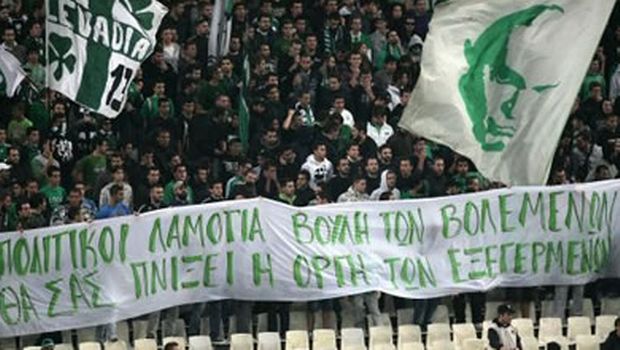 Προχθές είχε αναρτηθεί στο ΟΑΚΑ από τους φιλάθλους του ΠΑΟ ένα πανό που έγραφε: «Πολιτικοί λαμόγια, Βουλή των βολεμένων, θα σας πνίξει η οργή των εξεγερμένων». Η χωροφυλακή όχι μόνο απαίτησε να σταματήσει ο αγώνας και να κατέβει το πανό, αλλά μετά το τέλος του αγώνα έψαχνε τα αυτοκίνητα των φιλάθλων για να βρει το πανό και συνέλαβε και τους κατόχους του!!! Τέτοια Δημοκρατία. Δεν ξέρω εάν έχει σημασία ότι ο Παπουτσής είναι βάζελος και έβλεπε τον αγώνα …