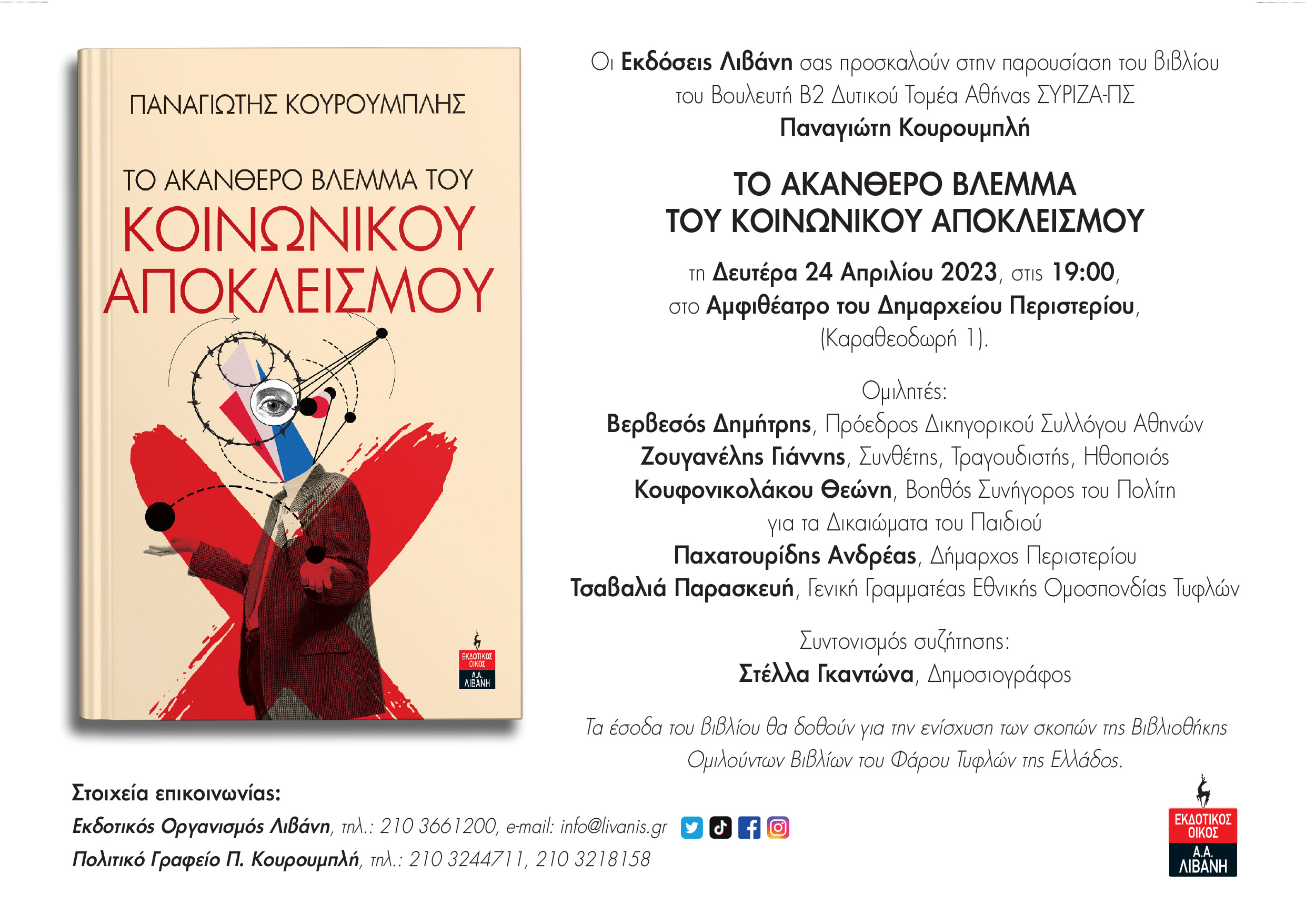 Το νέο του βιβλίο με τίτλο “ΤΟ ΑΚΑΝΘΕΡΟ ΒΛΕΜΜΑ ΤΟΥ ΚΟΙΝΩΝΙΚΟΥ ΑΠΟΚΛΕΙΣΜΟΥ” θα παρουσιάσει στο Περιστέρι ο βουλευτής του ΣΥΡΙΖΑ στο Δυτικό Τομέα Αθηνών, Παναγιώτης Κουρουμπλής.
