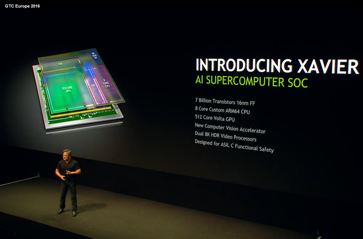 Η εταιρεία παρουσίασε στο συνέδριο GTC Europe 2016 το Nvidia Xavier, ένα νέο SoC που χαρακτηρίζει ως “υπερυπολογιστή τεχνητής νοημοσύνης” και γι’ αυτό εμπνεύστηκε από το ηγέτη των X-Men για την ονομασία του. Σύμφωνα με τις πρώτες εκτιμήσεις, το νέο SoC θα είναι έτοιμο για δοκιμές μέσα στον επόμενο χρόνο και θα έχει τη δυνατότητα εκτέλεσης 20 τρισεκατομμυριών λειτουργιών ανά δευτερόλεπτο (20TOPS).
