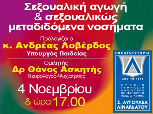 Ο Ανδρέας Λοβέρδος θα παρευρεθεί στο σεμινάριο «Σεξουαλική αγωγή και σεξουαλικώς μεταδιδόμενα νοσήματα» με ομιλητή τον Δρ Θάνο Ασκητή που τα Εκπαιδευτήρια Σ. Αυγουλέα-Λιναρδάτου.