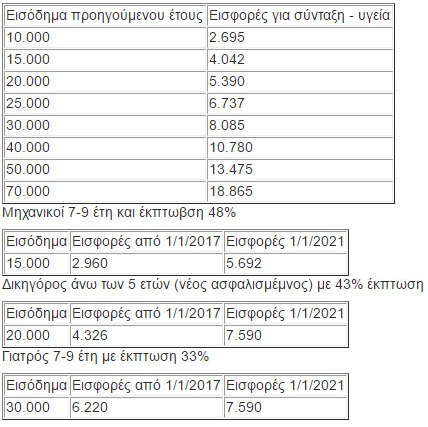 Οι νέοι επιστήμονες όπως και οι αγρότες δεν θα έχουν μεταβατική περίοδο και έτσι από 1/1/2017 θα πληρώνουν 6,95% του εισοδήματός τους για την υγεία. Οι μικροξενοδόχοι με πάνω από 5 δωμάτια εντάσσονται στον ΟΑΕΕ και θα πρέπει να πληρώνουν για σύνταξη και υγεία το 26,95% του εισοδήματός τους.