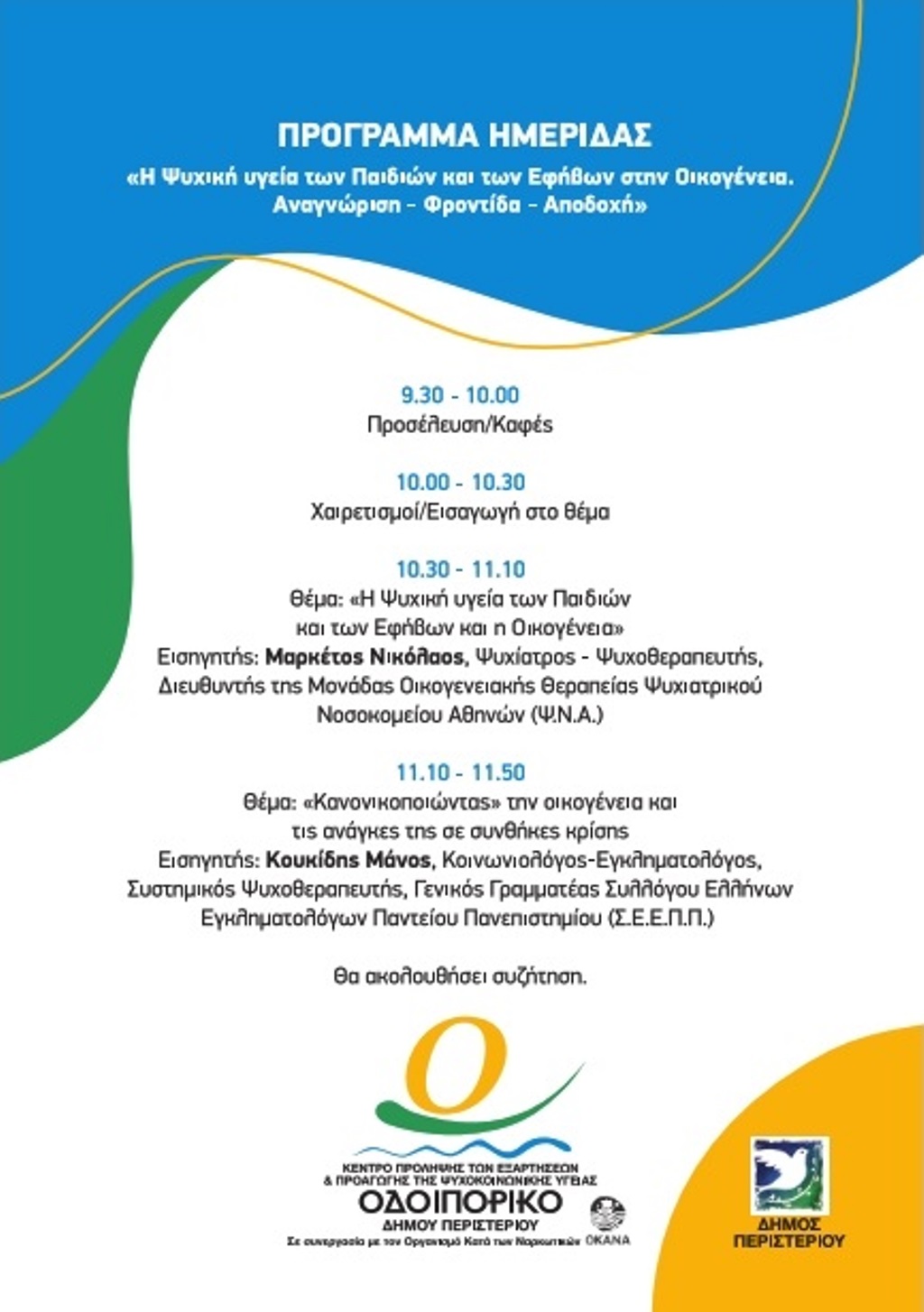 Το Κέντρο Πρόληψης των Εξαρτήσεων & Προαγωγής της Ψυχοκοινωνικής Υγείας Δήμου Περιστερίου “ΟΔΟΙΠΟΡΙΚΟ”, σε συνεργασία με τον Οργανισμό Κατά των Ναρκωτικών (ΟΚΑΝΑ), θα πραγματοποιήσει Ημερίδα με θέμα «Η Ψυχική υγεία των Παιδιών και των Εφήβων στην Οικογένεια. Αναγνώριση –Φροντίδα- Αποδοχή».