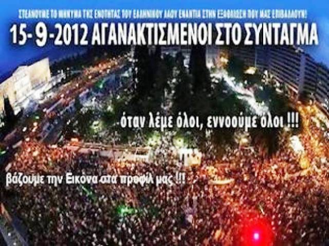 Στο Σύνταγμα θα συγκεντρωθούν για άλλη μια φορά οι Αγανακτισμένοι, το ραντεβού έχει δοθεί για σήμερα Σάββατο 15 Σεπτεμβρίου στις 18.00.