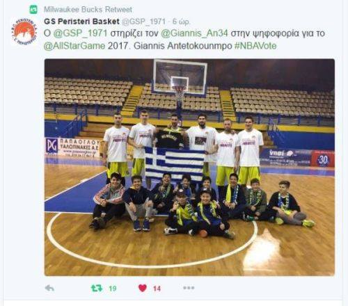 Τη στήριξή του στον Γιάννη Αντετοκούνμπο εξέφρασε μετά τον αγώνα κόντρα στο Μαρούσι ο Γ.Σ. Περιστερίου, γεγονός που δεν πέρασε απαρατήρητο από τους Μιλγουόκι Μπακς.